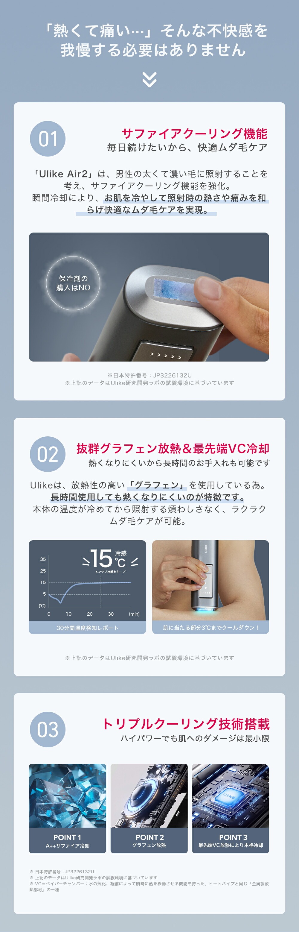 冷却機能がついており、瞬時に肌を冷やして痛みを軽減できます。肌を冷やしながら照射して、肌への刺激が少ないため、続けやすいのが魅力です。快適なムダ毛ケアが行えます。