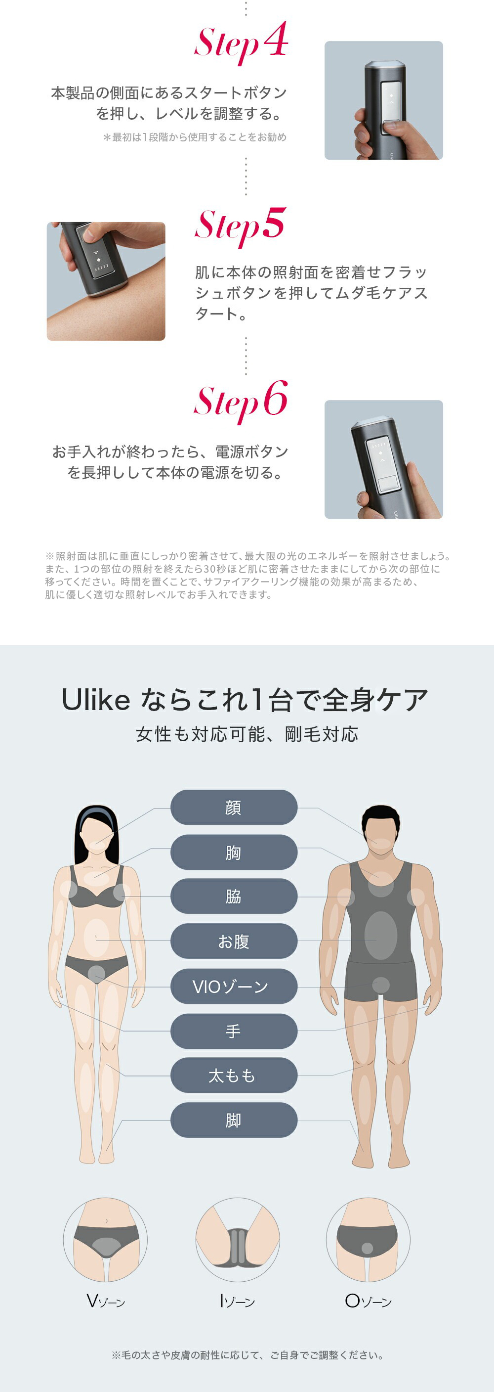 お手入れから定期的に使用で、約4週間目には、毛が目立たなくなり、生えるスピードがゆっくりになります。太く硬い毛質は4週間以上継続して使用すると、より変化が期待できます。1台で全身&どんな毛質にも照射できます。