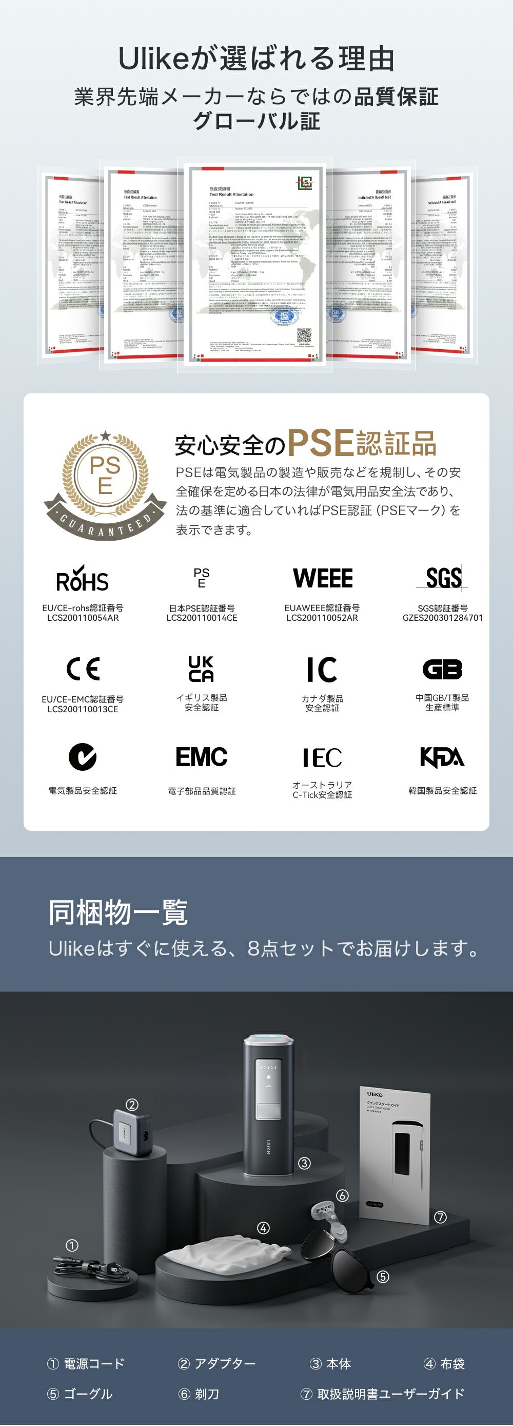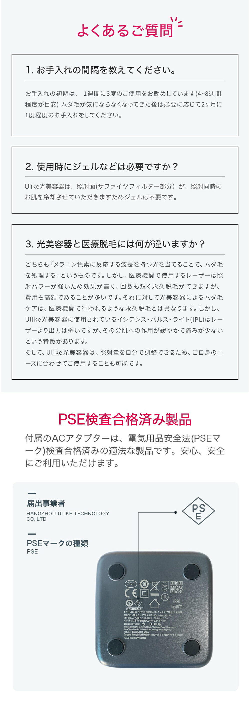 | PSE認証について | PSEマークの種類:特定電気用品 届出事業者名:South Korea Ulike Group Co.,Limited 登録検査機関名称:Shenzhen LCS Compliance Testing Laboratory Ltd.