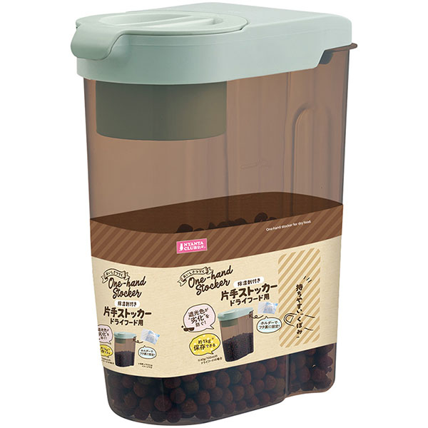 片手でフードを出せるお手軽サイズのストッカーです。・遮光色がフードの劣化を防ぐ・約1kg保存できる・付属の除湿剤+ホルダーをフタ裏にペタッと貼るだけ