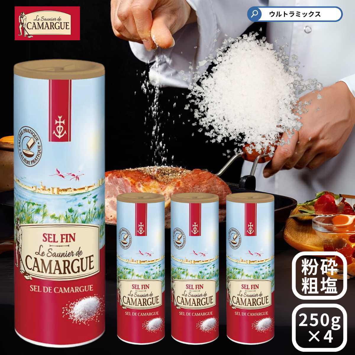「sel fin」は、粗塩 (gros sel) を細かく砕いたものを呼びます。ミネラル豊富な海塩の、甘味、苦味、旨味はさまざまな料理の美味しさを引き立たせます。細かくてさらさらしており、日本の一般的な塩に近いので使いやすいタイプです。'■SALINS サラン■1856年に創設されたサラングループは、幅広い種類の塩製品を取扱う国際的な企業です。フランスをはじめとしたイタリア、スペインなどのヨーロッパ諸国やアフリカにおいては塩の市場におけるリーダー的存在。サラン製品が輸出されるのは世界50ヶ国以上にのぼります。原材料名:海水(フランス)、酸化マグネシウム原産国:フランス内容量:250g×4本 保存方法:多湿を避け、常温で保存してください。カマルグ シリーズの違い■カマルグ フルール・ド・セル(ソルト) こちらは塩職人が手作業で採塩しているグレードの高いお塩として、料理の仕上げ用にお使いいただくことをお勧めしております。おすすめ料理:ビーフ、グリルした魚料理、サラダ、てんぷら■「カマルグ セルファン(ソルト) 『グロセル(粗塩)』を細かく砕いたもので、テーブル用や調理用としてどちらでもお使いいただける万能塩となっております。おすすめ料理:ポーク料理、野菜料理、野菜ソース関連キーワードカマルグの塩 カマルグ フルール ド セル 塩 塩化マグネシウム 天然塩 天日海塩 粗塩ミネラル 塩 業務用 魚料理 肉料理 野菜 レストラン シェフ カフェ ホテル フレンチ フランス料理 製菓 菓子 材料 カマルグ 地中海 塩 結晶 南仏 プロヴァンス 塩田 海水 フランス アルカン お塩 ソルト ミネラル 塩 ギフト プレゼント 母の日 父の日 ケーキ パティシエ ケーキ店 塩の花