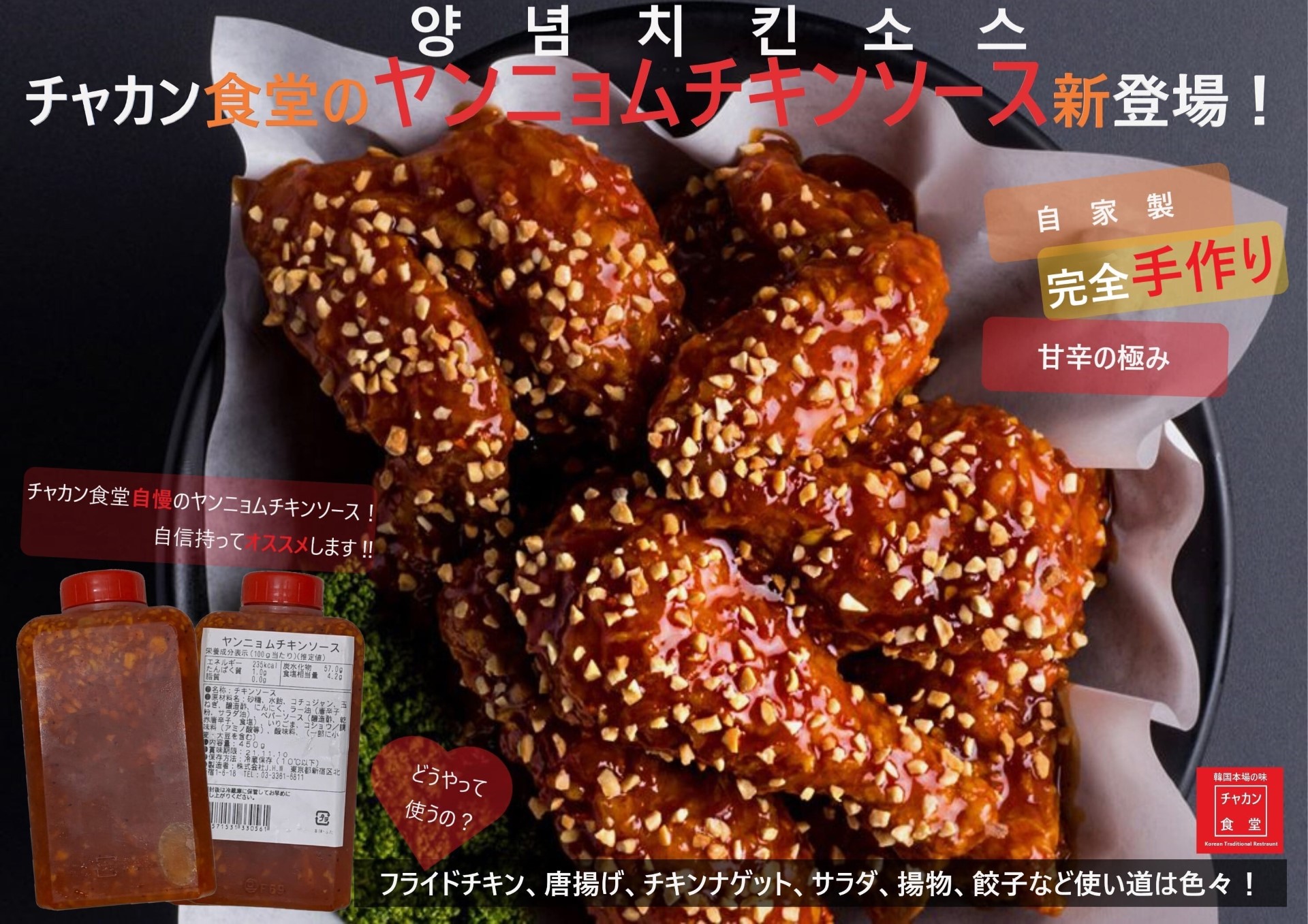 ヤンニョムチキンソースです。マイルドな辛さで甘辛い味で仕上げました。フライドチキンにつけて食べるほかにも唐揚げや揚げ物、サラダ、サンドイッチなど色んな料理にも合う使い方無限大のヤンニョムチキンソースです。