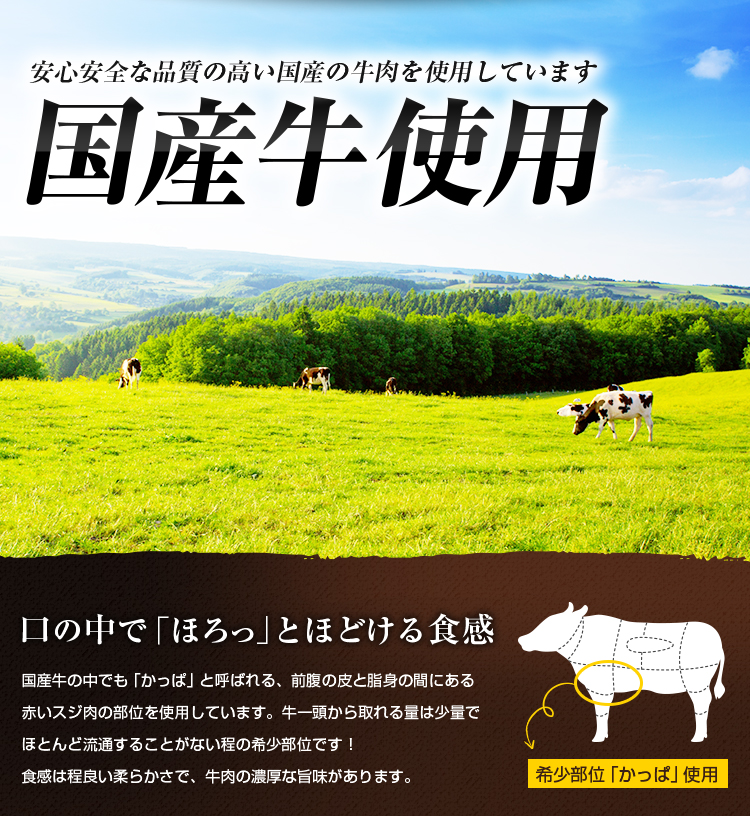 ■原材料:牛肉(国産)、食塩、こしょう、コーンスターチ、おろしにんにく/調味料(アミノ酸)