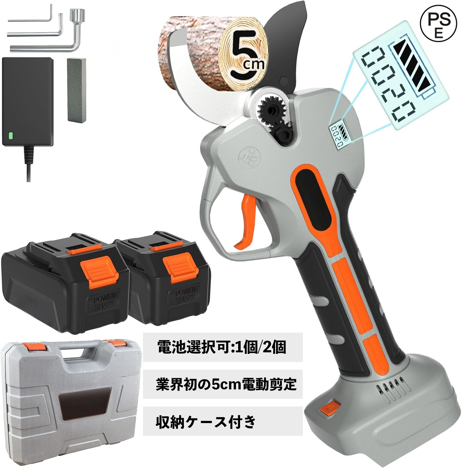 【50mm切断径】充電式剪定鋏は業界初の5cm電動剪定鋏、さいだい切断径50mmの枝を楽々に切れます。開き口は半開・全開の2段階に調節できる、半開なら小さな開口は作業時間と電力を節約し、全開なら太い枝を簡単に切れます。