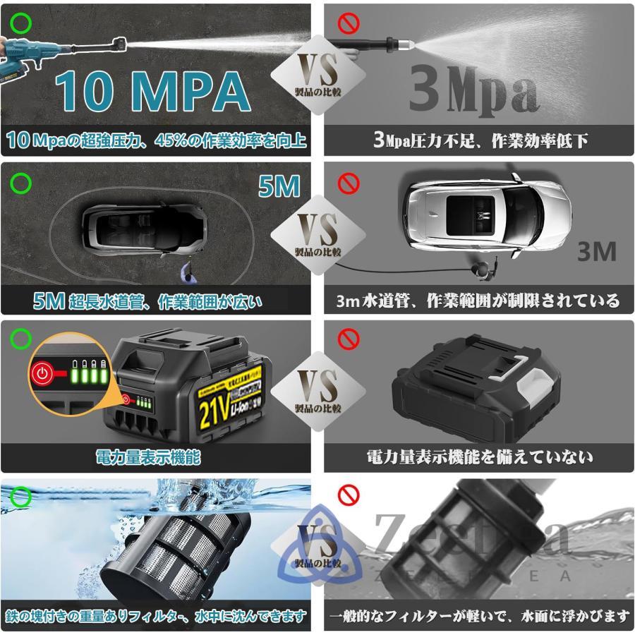大容量バッテリーで、低圧時は約25〜30分連続使用できて頻繁的に充電する手間がなくて、安心に使えます。【5m給水ホース】長いホースを搭載し、湖、川、やためておいた雨水などの水を使用する時にとても便利です。ホースが短くて池の水で洗車時に噴射水を車に届かないなど給水悩みと不便がなく更に使い便利です。