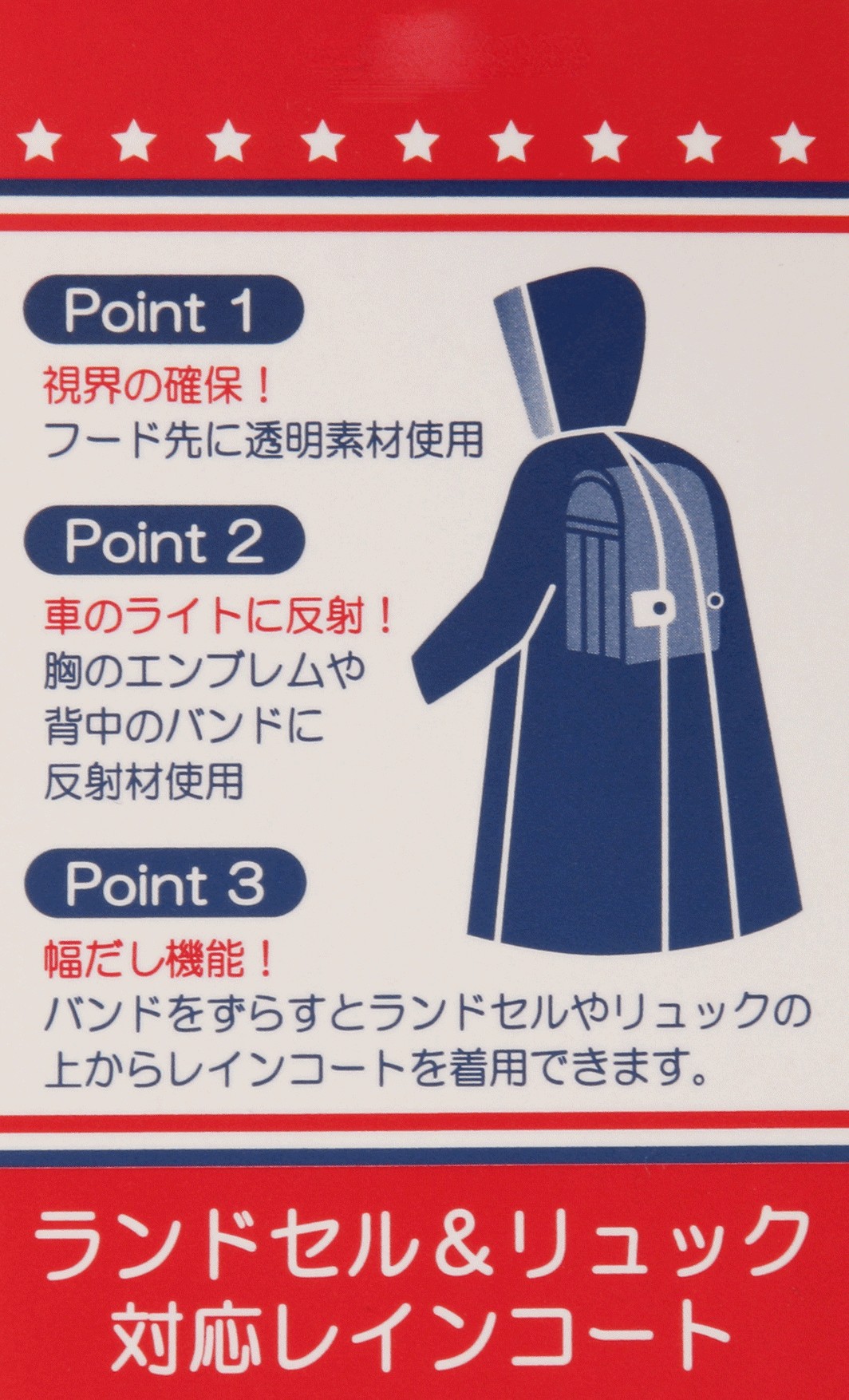 | 商品説明 | チャンピオンブランドの子供用レインコートです。背マチがついているので、ランドセルやリュックサックを背負った上から着ることができます。反射テープ付きです。校外学習の必需品です。 |