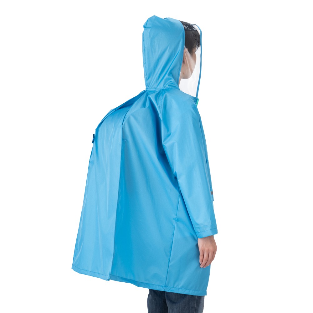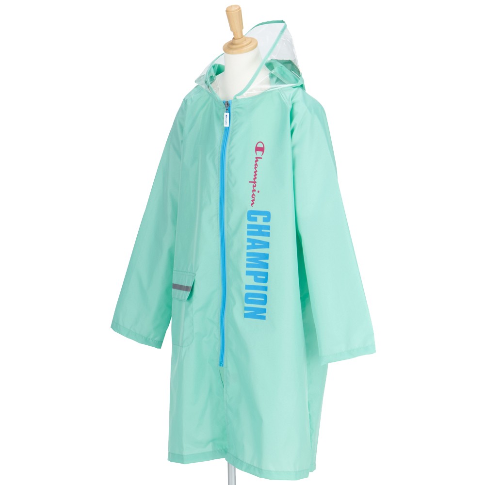 チャンピオンの子供用レインコートです。背マチがついているので、ランドセルやリュックサックを背負った上から着ることができます。反射テープ付きです。校外学習の必需品です。視界も確保しやすい様にフード先に透明資材使用しています。