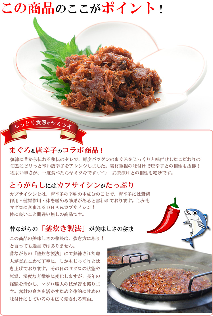焼津に昔から伝わる秘伝のタレで、鮮度バツグンのまぐろをじっくりと味付けしたこだわりの佃煮にピリっと辛い唐辛子をアレンジした珍味です。
