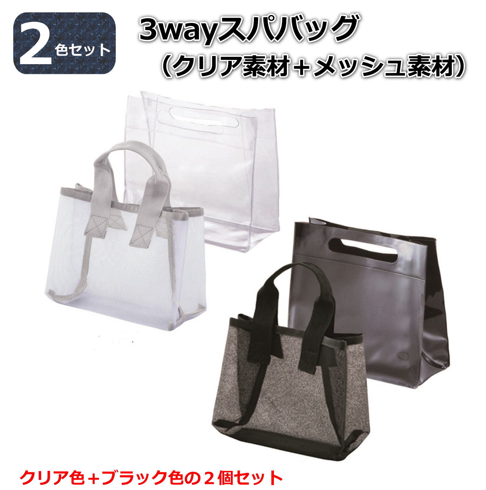 黒+クリアのスパバッグ2色セット。ペアで使い分けたり、家族や友人にプレゼントしても。
