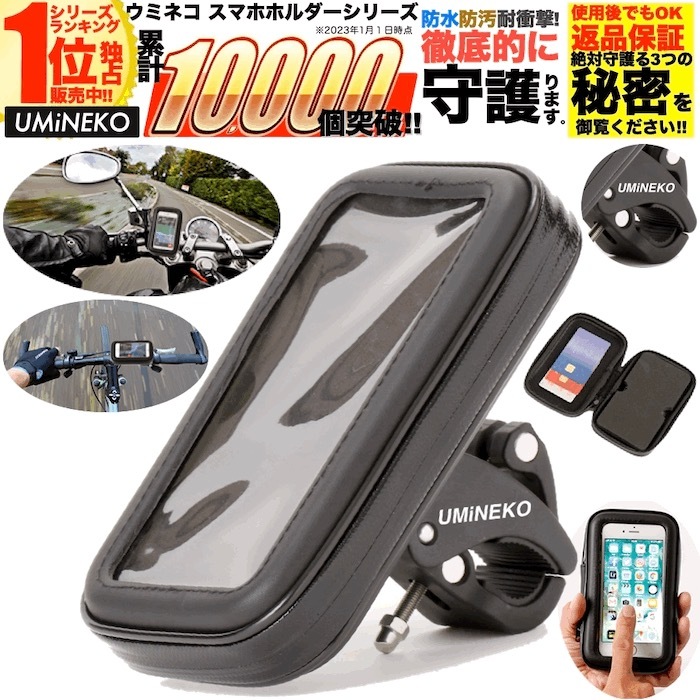| ■店長のコメント ■■■商品説明■■■ 使いやすい工夫があります! iPhone & Androidすべてのスマホ&ポータブルナビ対応 自転車&バイク防水ホルダー 1.突然の雨に対応出来る生活防水!! 2.防塵防汚耐衝撃!!中身を守る!! 3.回転360°&タッチ感度向上!! 4.万力&ゴム仕様でゴリラ並の固定力!! 5.万が一の落下防止リング2個付き!! 6.ナビも入ります!!カードも入ります!! 7.製品保証90日で安心お試し!! ■ウミネコが求めたものとは・・・ 一、突然の雨に降られても安心!! 防水・防塵・防汚性能で中身を守る。 一、万が一の落下事故パターンを想定して徹底的に守りたい! ゴリラ並の固定力&耐衝撃クッション &落下防止ワイヤー搭載!! 一、ケースに入れたままタッチ操作出来るのは当たり前!! 使いやすさやタッチ感度もこだわりたい!! 一、スマホだけじゃない。ナビも入る、カードも入る。お札も入る。 「あれ、財布いらないね」くらい便利が良い!! 一、そしてこれらのこだわり機能が お財布に優しく手に入れられること。 ウミネコの商品はこれらを全てクリアいたしました! ■全面防水・防塵・防汚カバー で急な雨だってもう安心! 本ホルダーは生活防水設計で急な雨でも安心。 また、ワンタッチでアームから取り外し、カバー単体での携帯も可能です。 現地に到着したらそのまま外して使用が出来るので、海・山・アウトドア・キャンプでも防水・防塵・防汚性能が大活躍。 ※非完全防水です。水中や豪雨の中、夜露が出る環境でのご使用はお控えください。 ■落下させない&落下しても守る3つの秘密!! 【その1:万力&ゴムベルト】 ホルダーは万力構造とゴムベルトで簡単に強力固定が可能です。 これにより振動や衝撃が生じても、ゴリラ並みの固定力で落下を防止します。 また、ゴムベルトは大切なバイクや自転車へのクランプによる傷の防止にもなります。 【その2:落下防止リング】 ありがちなゴムベルトではなく、 引っ張りに非常に強いワイヤーリングをお付けします。 ケースと車体を結びつけ、万が一ケースが取れてしまってもワイヤーリングが落下の一歩手前で繋ぎ止めます。 車体やお好みで選べる2色をご用意いたしました。 【その3:耐衝撃吸収クッション】 それでも手からスルリと落ちてしまうこともあるかと思います。 それでも大丈夫! 8mmと2mmの隙間調節マットと本体のクッション構造で落下の衝撃を最小限に抑え中身を守ります。 ■透明度の高いフィルム採用!見やすくてタッチ感度もアップ!! ケースに入れたままタッチ操作出来ることはもちろん、透明度の高い独自のフィルムを使用することで、従来品にくらべ、 【タッチ感度の向上】や【画面の見やすさ向上】を実現することができました。 安物にありがちな画面が見えづらいといったこともなく、スマホのポテンシャルを活かす仕様に仕上げております。 ■見やすい位置に画面固定できる!! 本ケースは360°回転し、縦・横・斜め16段階で固定可能となっております。 取り付け位置や画面の縦横仕様に合わせて見やすい角度に自由に調節することができます。 ■すべてのスマホサイズ対応済み!!ナビ・カード・お札なども入ります!! もちろんスマホだけ入れてもOKですが、これだけの機能ですから、薄いものは入れてしまって便利に使うことができます! 特にガソリンスタンドのカードを入れておくととっても便利。 カードやお札を入れておけば、わざわざ背中のリュックや腰のバッグから財布を取り出さなくても、目の前のケースからサッと取り出して使うことができます。 また、内寸が合えば、ポータブルナビなども入れることができます。 2種類の隙間クッションがありますので、細かい隙間調節もできます。 きっと「あれ、財布いらないね」くらい便利に使うことができますよ! ■お財布にとっても優しくご提供が可能となりました! 「でもこれだけこだわりの機能だからお高いんでしょ?」 いえいえ!大丈夫です!今回もウミネコの商品企画開発部門頑張りました! ・工場直取引! ・問屋を通さない! ・流通の最適化! ・徹底的なシステム化! などなど、 あらゆる工夫を徹底的に行い、大幅なコストカットを実現! こだわりのある商品ですが、お財布にとても優しくご提供することができるようになりました! ありがたいことにリピーター様も順調に増えております! ぜひぜひお試しくださいね! ■■■仕様詳細■■■ ■参考適用サイズ S(内寸12.5 x 6.0 x 2.5cm): iPhone 4 M(内寸13.5 x 7.5 x 2.5cm): iPhone 5 / iPhone 5s Xperia X Compact L(15.0 x 8.5 x 2.5cm): iPhone 6 / 7/ 8 / X / XS Xperia Z5 / XZ / GalaxyFeel / s7 / s8 XL(16.8 x 9.2 x 2.5cm): iPhone 7 plus / 8 plus / XS Max / XR Xperia XZ Premium Galaxy note 7 / s8+ ■セット内容 ・防水ケース ・クランプ ・傷防止ゴムベルト ・隙間調節マット (8mm/2mm) ・落下防止ワイヤーリング 2本 ■機能やメリットなど ・突然の雨に対応出来る生活防水!! ・防塵、防汚、耐衝撃!!中身を守る3機能!! ・360°回転&タッチ感度向上!! ・万力&ゴム仕様でゴリラ並の固定力!! ・万が一の落下防止リング2個付き!! 