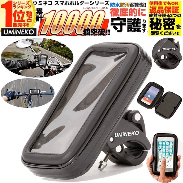 | ■店長のコメント ■■■商品説明■■■ 使いやすい工夫があります! iPhone & Androidすべてのスマホ&ポータブルナビ対応 自転車&バイク防水ホルダー 1.突然の雨に対応出来る生活防水!! 2.防塵防汚耐衝撃!!中身を守る!! 3.回転360°&タッチ感度向上!! 4.万力&ゴム仕様でゴリラ並の固定力!! 5.万が一の落下防止リング2個付き!! 6.ナビも入ります!!カードも入ります!! 7.製品保証90日で安心お試し!! ■ウミネコが求めたものとは・・・ 一、突然の雨に降られても安心!! 防水・防塵・防汚性能で中身を守る。 一、万が一の落下事故パターンを想定して徹底的に守りたい! ゴリラ並の固定力&耐衝撃クッション &落下防止ワイヤー搭載!! 一、ケースに入れたままタッチ操作出来るのは当たり前!! 使いやすさやタッチ感度もこだわりたい!! 一、スマホだけじゃない。ナビも入る、カードも入る。お札も入る。 「あれ、財布いらないね」くらい便利が良い!! 一、そしてこれらのこだわり機能が お財布に優しく手に入れられること。 ウミネコの商品はこれらを全てクリアいたしました! ■全面防水・防塵・防汚カバー で急な雨だってもう安心! 本ホルダーは生活防水設計で急な雨でも安心。 また、ワンタッチでアームから取り外し、カバー単体での携帯も可能です。 現地に到着したらそのまま外して使用が出来るので、海・山・アウトドア・キャンプでも防水・防塵・防汚性能が大活躍。 ※非完全防水です。水中や豪雨の中、夜露が出る環境でのご使用はお控えください。 ■落下させない&落下しても守る3つの秘密!! 【その1:万力&ゴムベルト】 ホルダーは万力構造とゴムベルトで簡単に強力固定が可能です。 これにより振動や衝撃が生じても、ゴリラ並みの固定力で落下を防止します。 また、ゴムベルトは大切なバイクや自転車へのクランプによる傷の防止にもなります。 【その2:落下防止リング】 ありがちなゴムベルトではなく、 引っ張りに非常に強いワイヤーリングをお付けします。 ケースと車体を結びつけ、万が一ケースが取れてしまってもワイヤーリングが落下の一歩手前で繋ぎ止めます。 車体やお好みで選べる2色をご用意いたしました。 【その3:耐衝撃吸収クッション】 それでも手からスルリと落ちてしまうこともあるかと思います。 それでも大丈夫! 8mmと2mmの隙間調節マットと本体のクッション構造で落下の衝撃を最小限に抑え中身を守ります。 ■透明度の高いフィルム採用!見やすくてタッチ感度もアップ!! ケースに入れたままタッチ操作出来ることはもちろん、透明度の高い独自のフィルムを使用することで、従来品にくらべ、 【タッチ感度の向上】や【画面の見やすさ向上】を実現することができました。 安物にありがちな画面が見えづらいといったこともなく、スマホのポテンシャルを活かす仕様に仕上げております。 ■見やすい位置に画面固定できる!! 本ケースは360°回転し、縦・横・斜め16段階で固定可能となっております。 取り付け位置や画面の縦横仕様に合わせて見やすい角度に自由に調節することができます。 ■すべてのスマホサイズ対応済み!!ナビ・カード・お札なども入ります!! もちろんスマホだけ入れてもOKですが、これだけの機能ですから、薄いものは入れてしまって便利に使うことができます! 特にガソリンスタンドのカードを入れておくととっても便利。 カードやお札を入れておけば、わざわざ背中のリュックや腰のバッグから財布を取り出さなくても、目の前のケースからサッと取り出して使うことができます。 また、内寸が合えば、ポータブルナビなども入れることができます。 2種類の隙間クッションがありますので、細かい隙間調節もできます。 きっと「あれ、財布いらないね」くらい便利に使うことができますよ! ■お財布にとっても優しくご提供が可能となりました! 「でもこれだけこだわりの機能だからお高いんでしょ?」 いえいえ!大丈夫です!今回もウミネコの商品企画開発部門頑張りました! ・工場直取引! ・問屋を通さない! ・流通の最適化! ・徹底的なシステム化! などなど、 あらゆる工夫を徹底的に行い、大幅なコストカットを実現! こだわりのある商品ですが、お財布にとても優しくご提供することができるようになりました! ありがたいことにリピーター様も順調に増えております! ぜひぜひお試しくださいね! ■■■仕様詳細■■■ ■参考適用サイズ S(内寸12.5 x 6.0 x 2.5cm): iPhone 4 M(内寸13.5 x 7.5 x 2.5cm): iPhone 5 / iPhone 5s Xperia X Compact L(15.0 x 8.5 x 2.5cm): iPhone 6 / 7/ 8 / X / XS Xperia Z5 / XZ / GalaxyFeel / s7 / s8 XL(16.8 x 9.2 x 2.5cm): iPhone 7 plus / 8 plus / XS Max / XR Xperia XZ Premium Galaxy note 7 / s8+ ■セット内容 ・防水ケース ・クランプ ・傷防止ゴムベルト ・隙間調節マット (8mm/2mm) ・落下防止ワイヤーリング 2本 ■機能やメリットなど ・突然の雨に対応出来る生活防水!! ・防塵、防汚、耐衝撃!!中身を守る3機能!! ・360°回転&タッチ感度向上!! ・万力&ゴム仕様でゴリラ並の固定力!! ・万が一の落下防止リング2個付き!! 