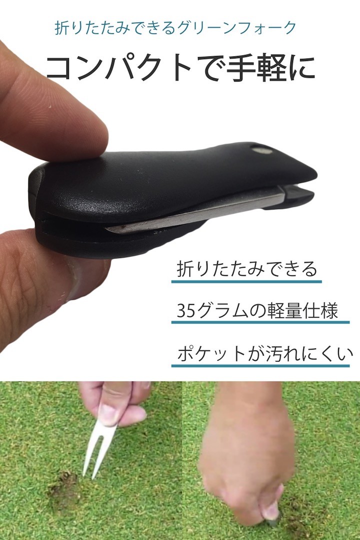 グリーンフォーク ボールマーカー付き 折りたたみ式 ゴルフフォーク 芝 ディボット ボールマーク 修繕用 軽い コンパクト プレゼント 景品 ワンタッチ操作