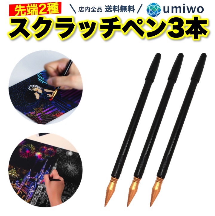 商品名:スクラッチペン 3本セット 先端2種類 両端 キャップ 極細 通常 ペン 入門 初心者 スクラッチアート スクラッチカード ペン先 潰れ 消耗品