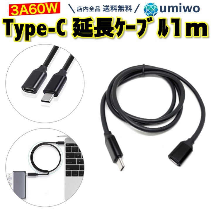 商品名:Type-c 延長ケーブル 長さ1m 3A 60W USB2.0 PD対応 急速充電 データ転送 ノートPC パソコン macbook タイプC USB-C 充電 シンプル