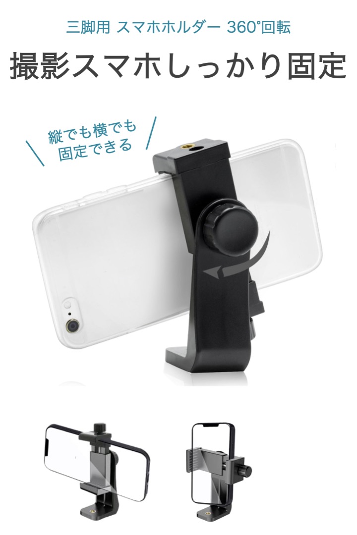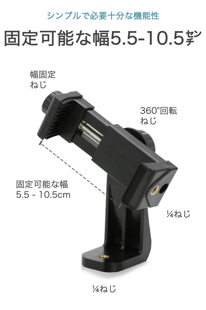 商品名:三脚用 スマホホルダー 360°回転 ねじ式 固定 最大幅10.5cm アタッチメント 三脚 スマートフォン 取り付け 撮影 固定 ケース クランプ スマホ三脚ホルダー