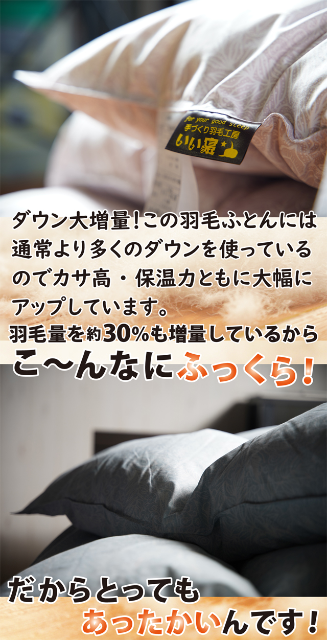 良質なグースダウン93%を約30%増量しているのでカサ高・保温性が大幅に向上しています。