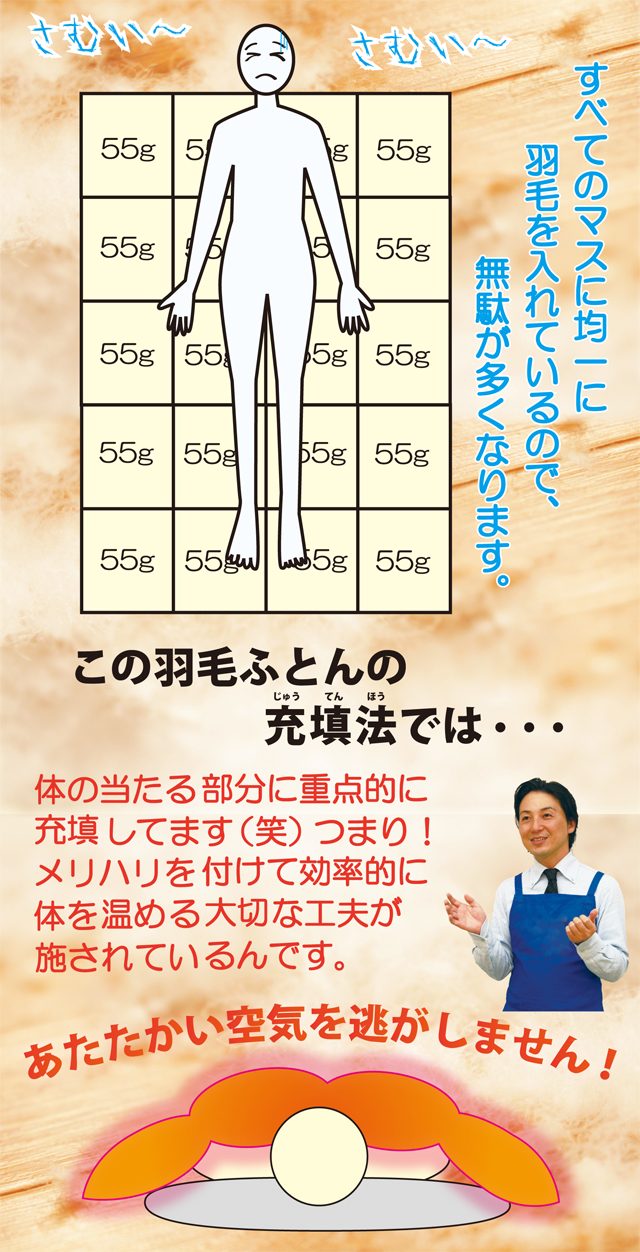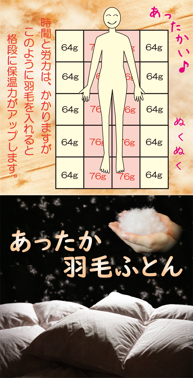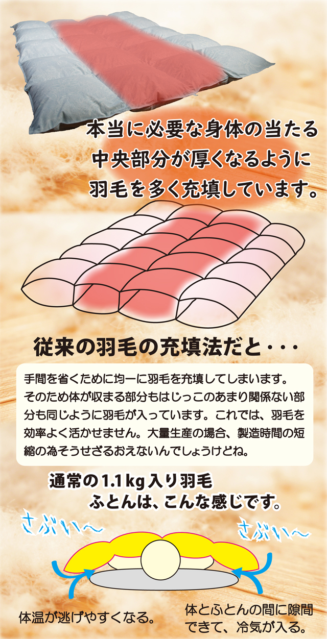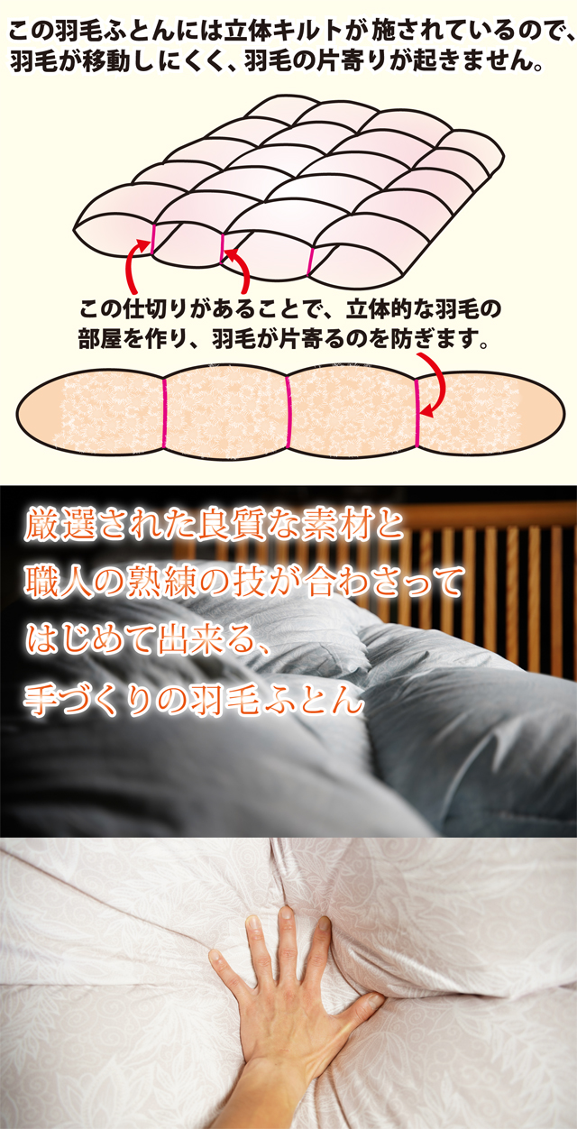 ● 他にはない特徴:一枚一枚、熟練の職人が羽毛にこだわり、生地にこだわり、ダウンの充填法にもこだわり抜いて製造しています。