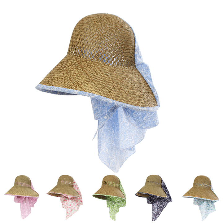 麦わら×生地のガーデニングハットです。首元・顔周りを日差しからしっかりガードします。
