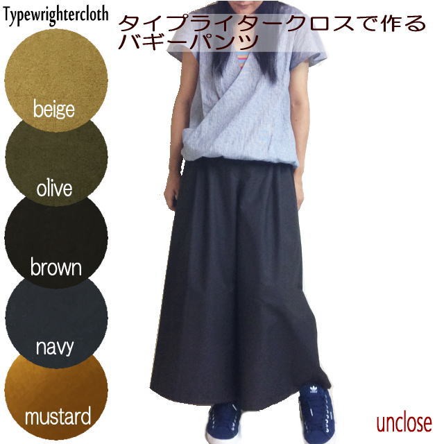 軽いはき心地のタイプライタークロスで作るバギーパンツのキットです。