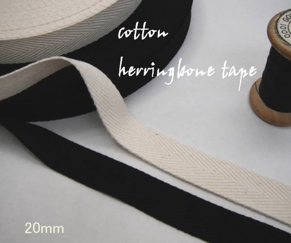 コットン100%のヘリンボーンテープ20mm巾です。しっかりしていてナチュラル感あるテープです。