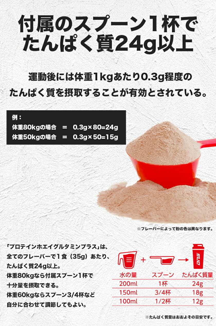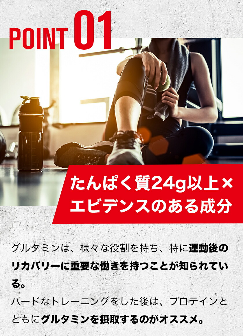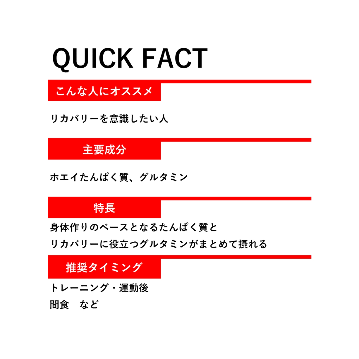栄養価【1食(33g)あたり】エネルギー:136kcal、たんぱく質:24.9g(無水物換算値:25.3g)、脂質:2.0g、炭水化物:4.5g、食塩相当量:0.4g、グルタミン:5,000mg ※値はチョコレート、その他フレーバーについては商品画像を参照