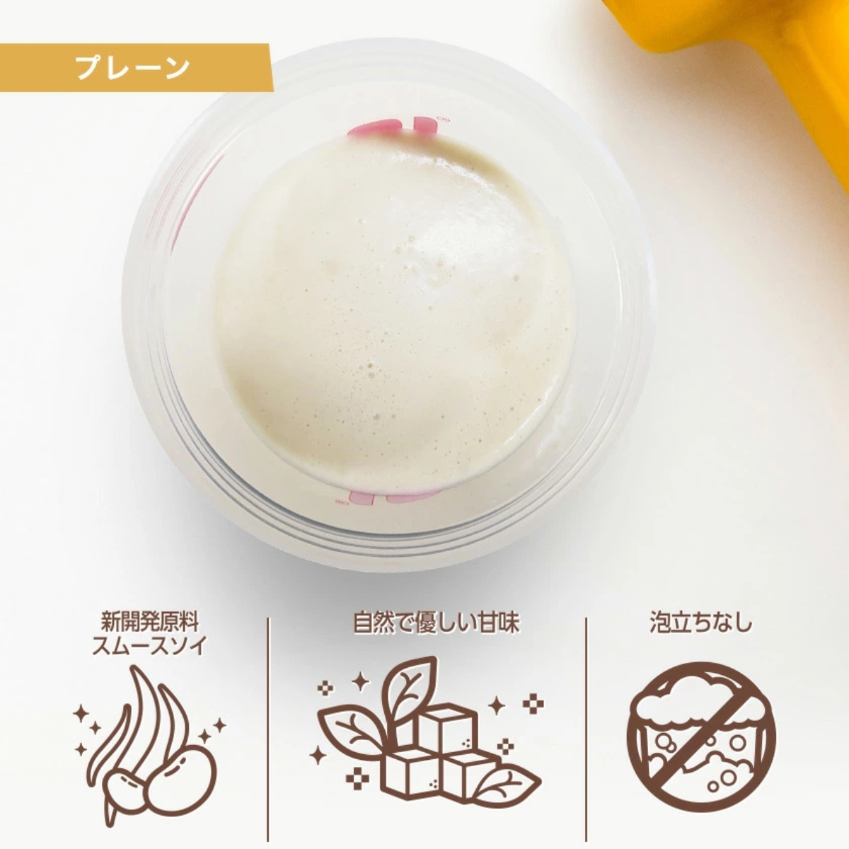 独自開発の原料である「スムースソイ」を使用し、従来のソイプロテインと比べ、ザラつきや苦みを大幅に改善しました。さらりとした飲み口が特長です。