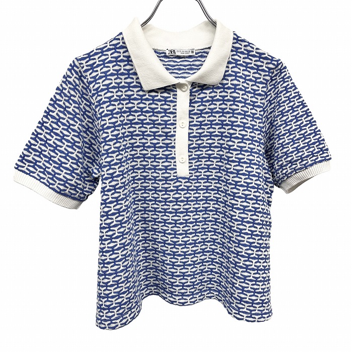 | 商品タイトル | ザラ ZARA ポロシャツ ショート丈 総柄 裾が若干フレア 半袖 ポリ×レーヨン×綿×アクリル×ナイロン S ブルー 青×白 レディース |