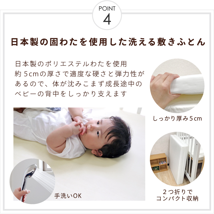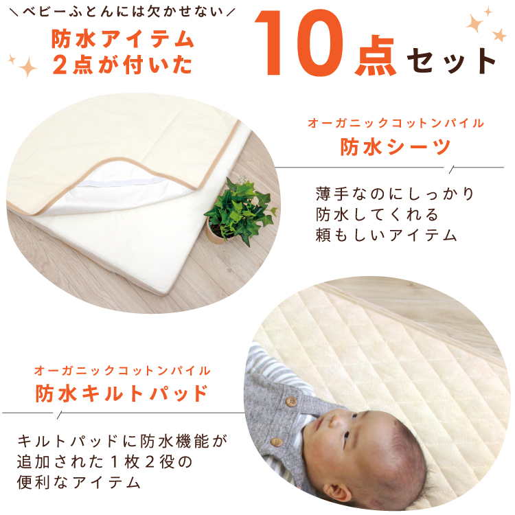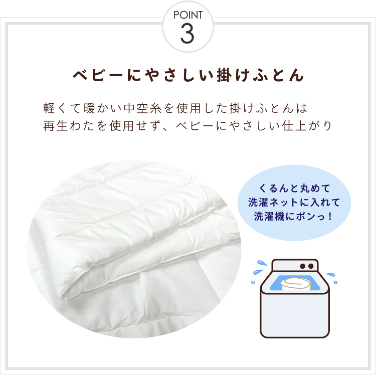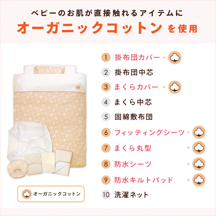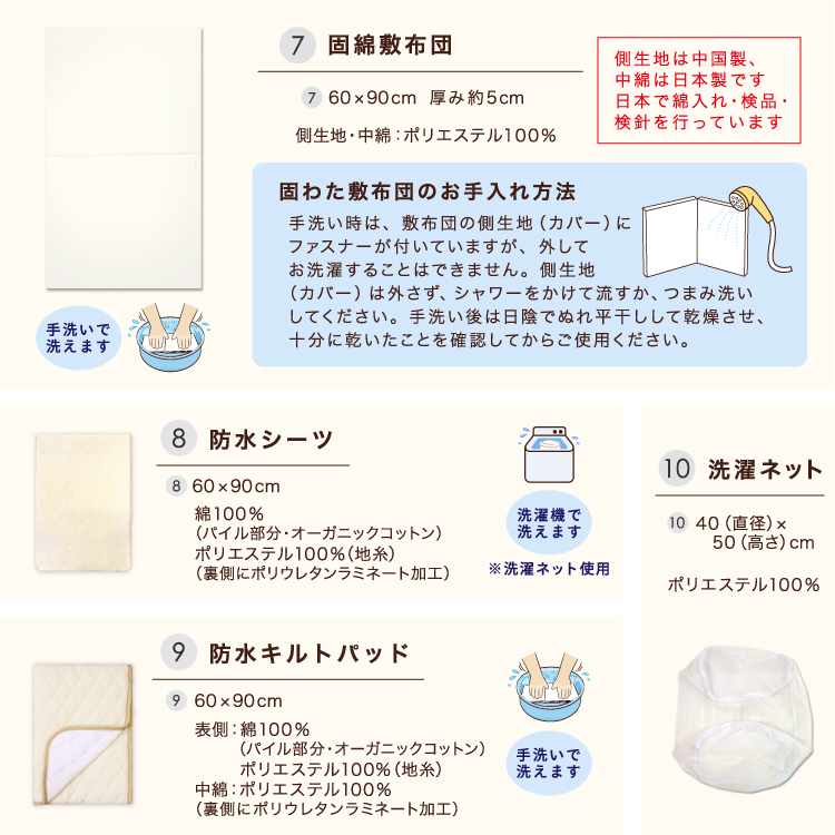 | 【1】ミニ掛布団カバー<サイズ:80×105cm> ■日本製 綿100%(オーガニックコットンダブルガーゼ) 【2】ミニ掛布団中芯<サイズ:76×100cm> ■中国製 側生地/ポリエステル65%・綿35% 中綿/ポリエステル100% 【3】枕カバー<サイズ:26×42cm> ■日本製 綿100%(オーガニックコットンダブルガーゼ) 【4】枕中芯<サイズ:22×33cm> ■中国製 側生地/ポリエステル65%・綿35% 中身/ポリエチレン樹脂 【5】ミニ固綿敷布団<サイズ:60×90cm(厚み約5cm)> ■側生地:中国製 中綿:日本製 側生地・中綿/ポリエステル100% 【6】ミニフィッティングシーツ<サイズ:60×90cm> ■日本製 綿100%(オーガニックコットンダブルガーゼ) 【7】ベビー枕<21×18cm> ■日本製 側生地/綿100%(オーガニックコットンダブルガーゼ) 中身/ポリエチレン樹脂 【8】ミニ防水シーツ<60×90cm> ■中国製 綿100%(パイル部分)(オーガニックコットン) ポリエステル100%(地糸) (裏側にポリウレタンラミネート加工) 【9】ミニ防水キルトパッド<60×90cm> ■中国製 綿100%(パイル部分)(オーガニックコットン) ポリエステル100%(地糸) 中綿/ポリエステル100% (裏側にポリウレタンラミネート加工) 【10】洗濯ネット<直径40×高さ50cm> ■中国製 ポリエステル100% 内寸サイズが長さ90cm×幅60cmのベビーベッドに対応しています。 |