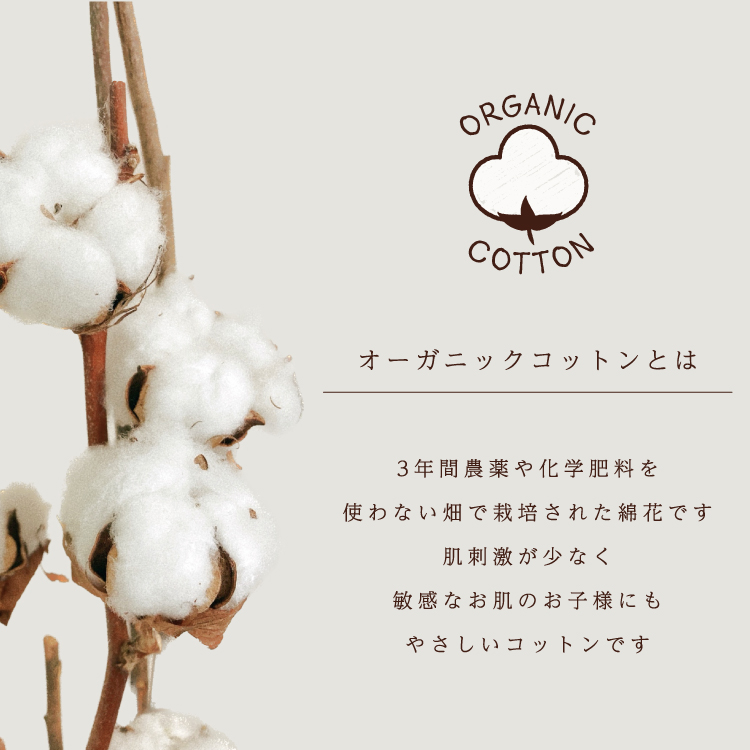 | オーガニックコットンは薬品処理をしていないため、天然コットン特有のにおいがあります。においが気になる場合は風通しの良い場所で陰干ししていただくと徐々に和らぎます。 |