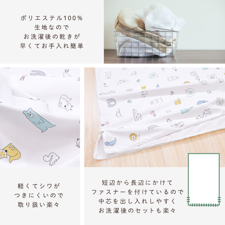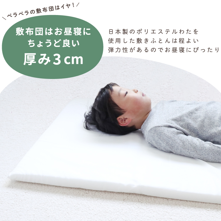 こだわりの敷き布団敷き布団は日本製のポリエステルわたを使用し、程よい弾力性があるのでお昼寝にぴったりです。