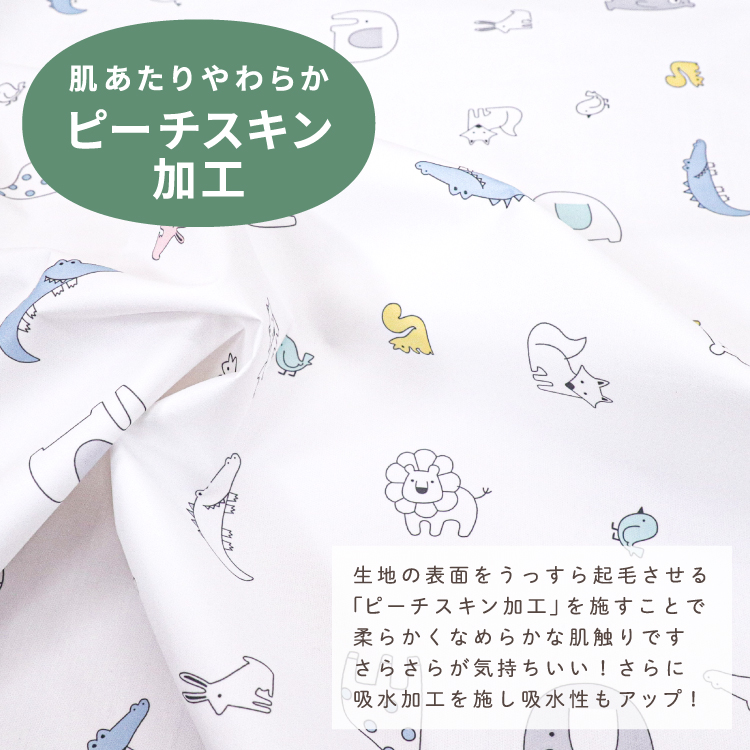 さらっと吸水 肌あたりやわらか汗っかきな赤ちゃんも快適な睡眠ができるように考えられた、吸水加工を施したなめらかでさらっとした肌触りのピーチスキン生地を使用。