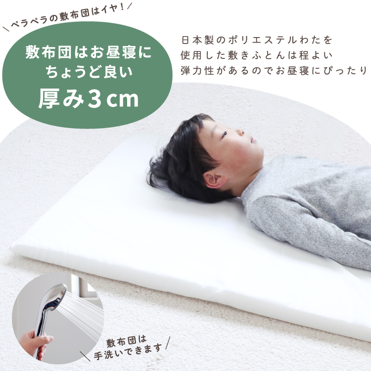敷き布団は日本製のポリエステルわたを使用し、程よい弾力性があるのでお昼寝にぴったりです。