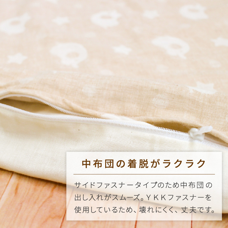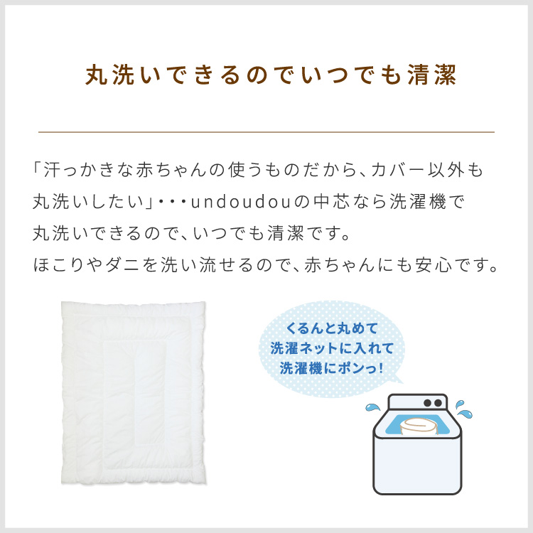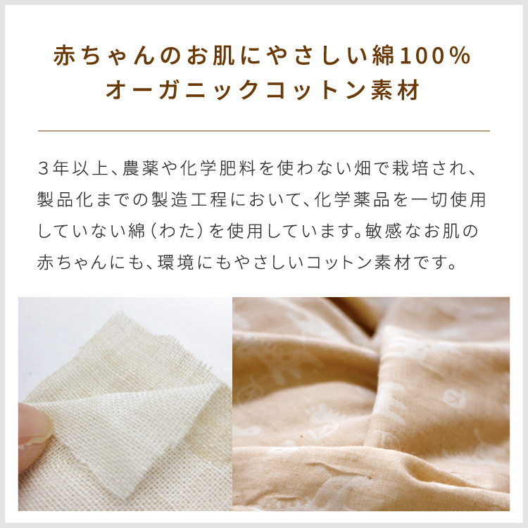 カバーにオーガニックコットンダブル生地を使用したベビー掛布団は、カバーと中芯がセットになっています。
