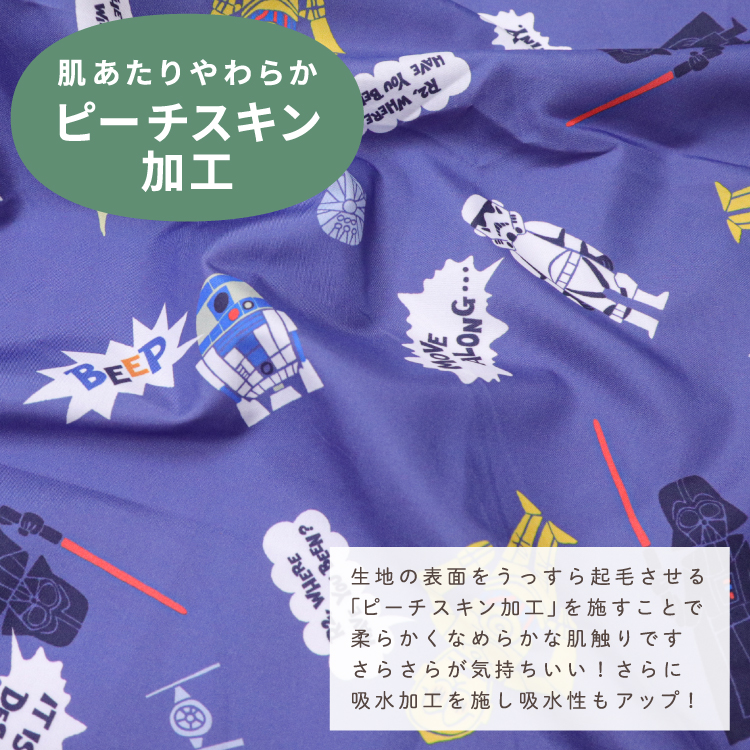 さらっと吸水 肌あたりやわらか汗っかきなお子様も快適な睡眠ができるように考えられた、吸水加工を施したなめらかでさらっとした肌触りのピーチスキン生地を使用。