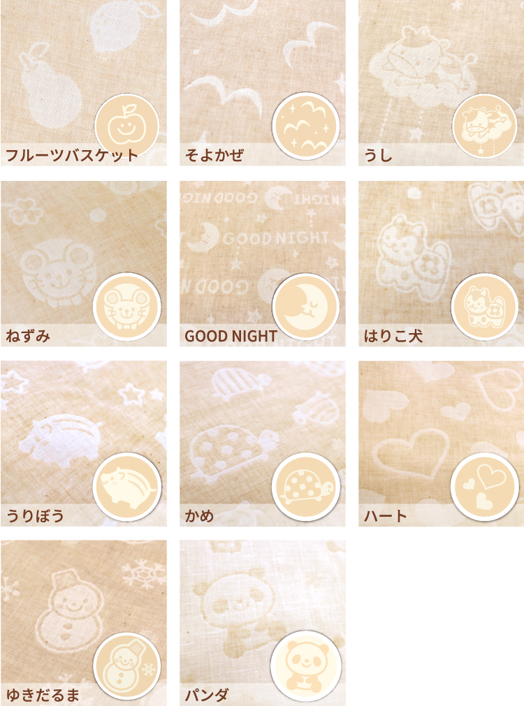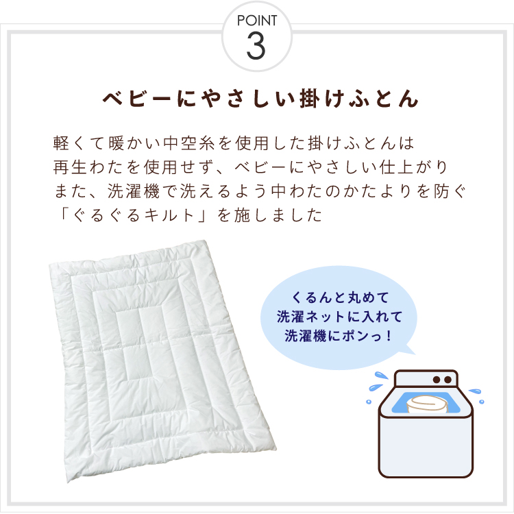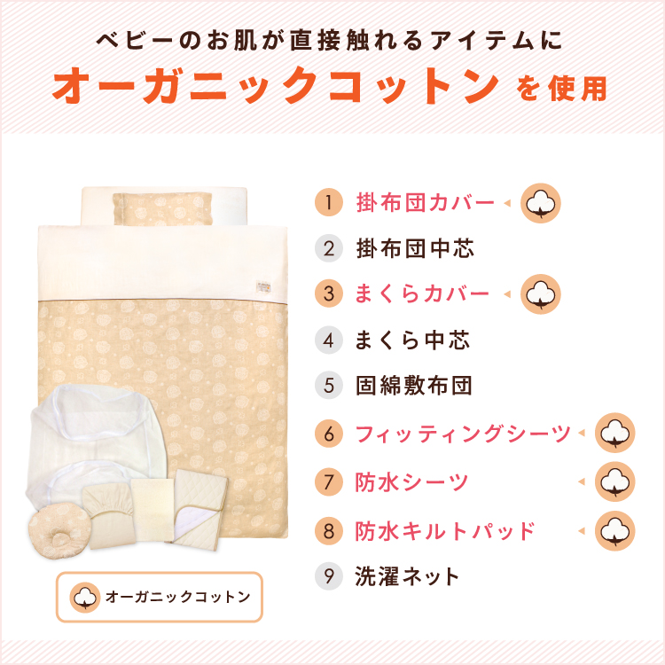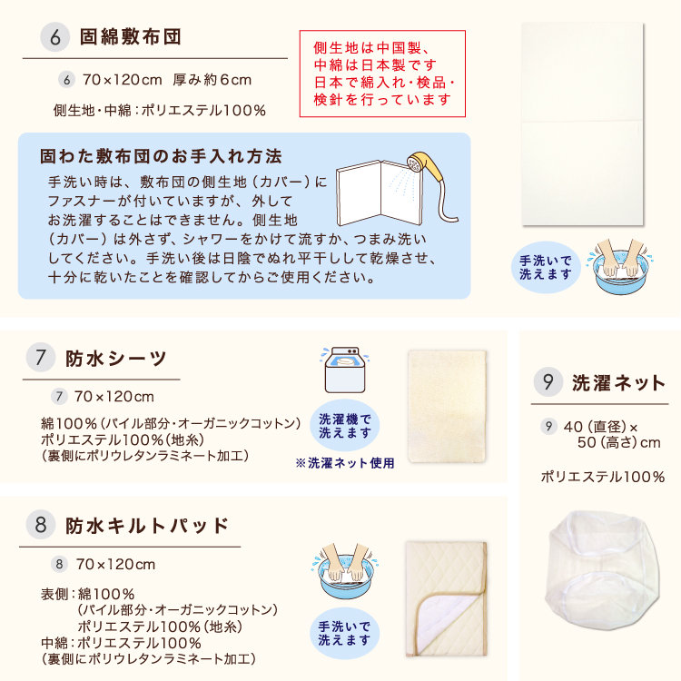 | 【1】掛布団カバー<105×130cm> ■日本製 綿100%(オーガニックコットンダブルガーゼ) 【2】掛布団中芯<95×122cm>(重量:約300g) ■中国製 側生地/ポリエステル65%・綿35% 中綿/ポリエステル100% 【3】枕カバー<26×42cm> ■日本製 綿100%(オーガニックコットンダブルガーゼ) 【4】枕中芯<22×33cm> ■中国製 側生地/ポリエステル65%・綿35% 中身/ポリエチレン樹脂 【5】固綿敷布団<70×120cm(厚み6cm)> ■側生地:中国製 中綿:日本製 側生地・中綿/ポリエステル100% 【6】フィッティングシーツ<70×120cm> ■中国製 綿100%(オーガニックコットンダブルガーゼ) 【7】防水シーツ<70×120cm> ■中国製 綿100%(パイル部分・オーガニックコットン) ポリエステル100%(地糸) (裏側ポリウレタンラミネート加工) 【8】防水キルトパッド<70×120cm> ■中国製 表側/綿100%(パイル部分・オーガニックコットン) ポリエステル100%(地糸) 中綿/ポリエステル100% (裏側にポリウレタンラミネート加工) 【9】洗濯ネット<直径40×高さ50cm> ■中国製 ポリエステル100% 内寸サイズが長さ120cm×幅70cmのベビーベッドに対応しています。 |