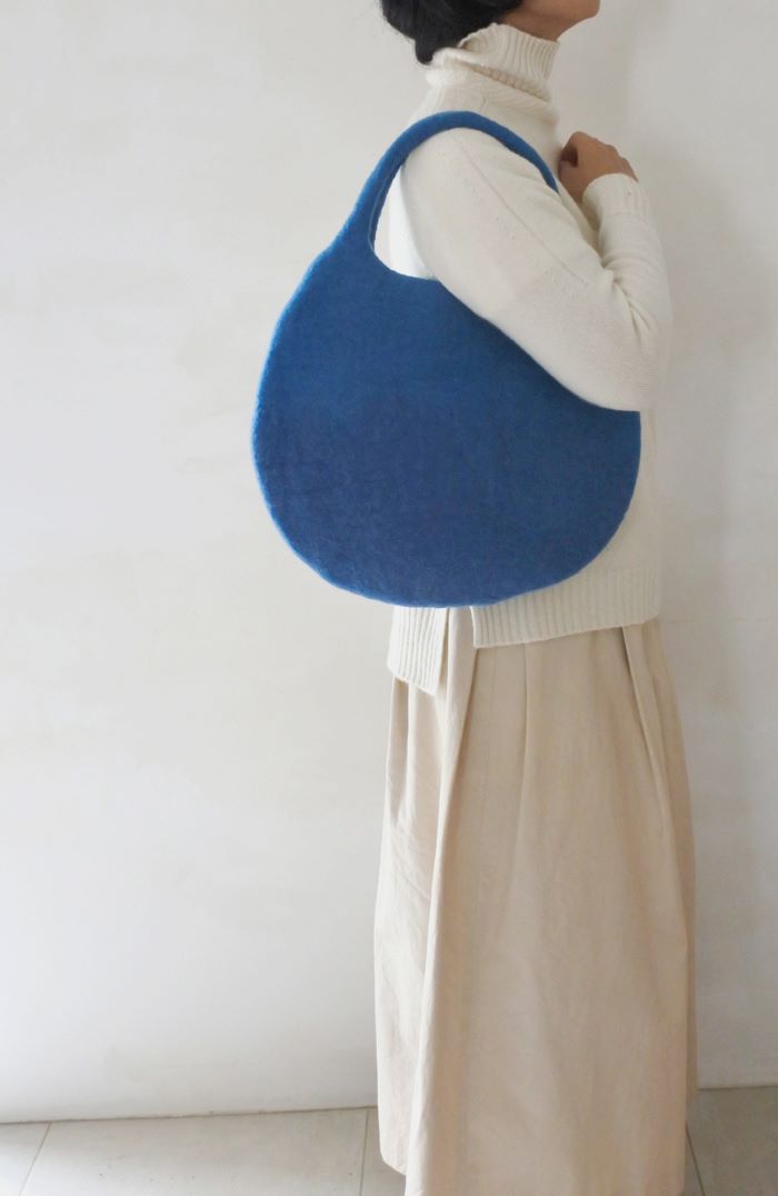 ふわふわの羊毛を、もみ・巻き・縮絨(しゅくじゅう)を繰り返して生まれる、ハンドメイドならではの丸い形のバッグです。ひとつひとつ手仕事で作った、のあたたかみを感じられます。