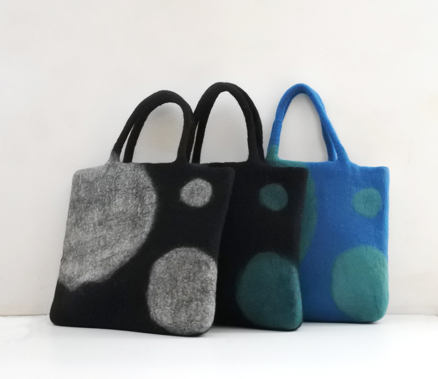 ふわふわの羊毛を、もみ・巻き・縮絨(しゅくじゅう)を繰り返して生まれる、ハンドメイドならではのドットのバッグです。ドットの模様は一緒にローリングで作るため、横長になったり、縦長になったり、一部が少し薄くなったりと形を作るのがとても難しく試行錯誤しながら製作。