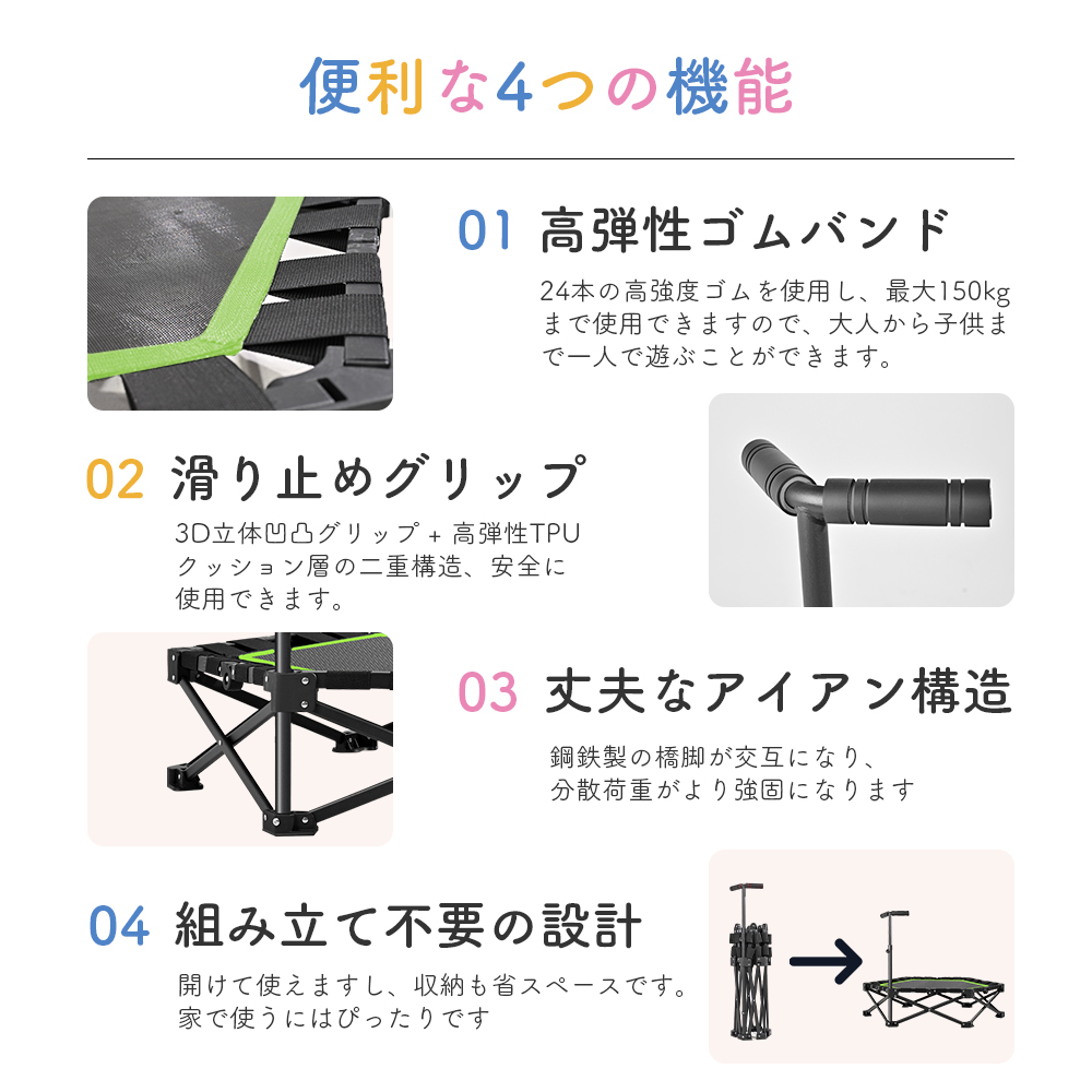 トランポリン 折りたたみ 組立不要 コンパクト 収納便利 106CM 手すり付き 耐荷重150kg 静音 ダイエット 高さ調整 子供 大人 トレーニング