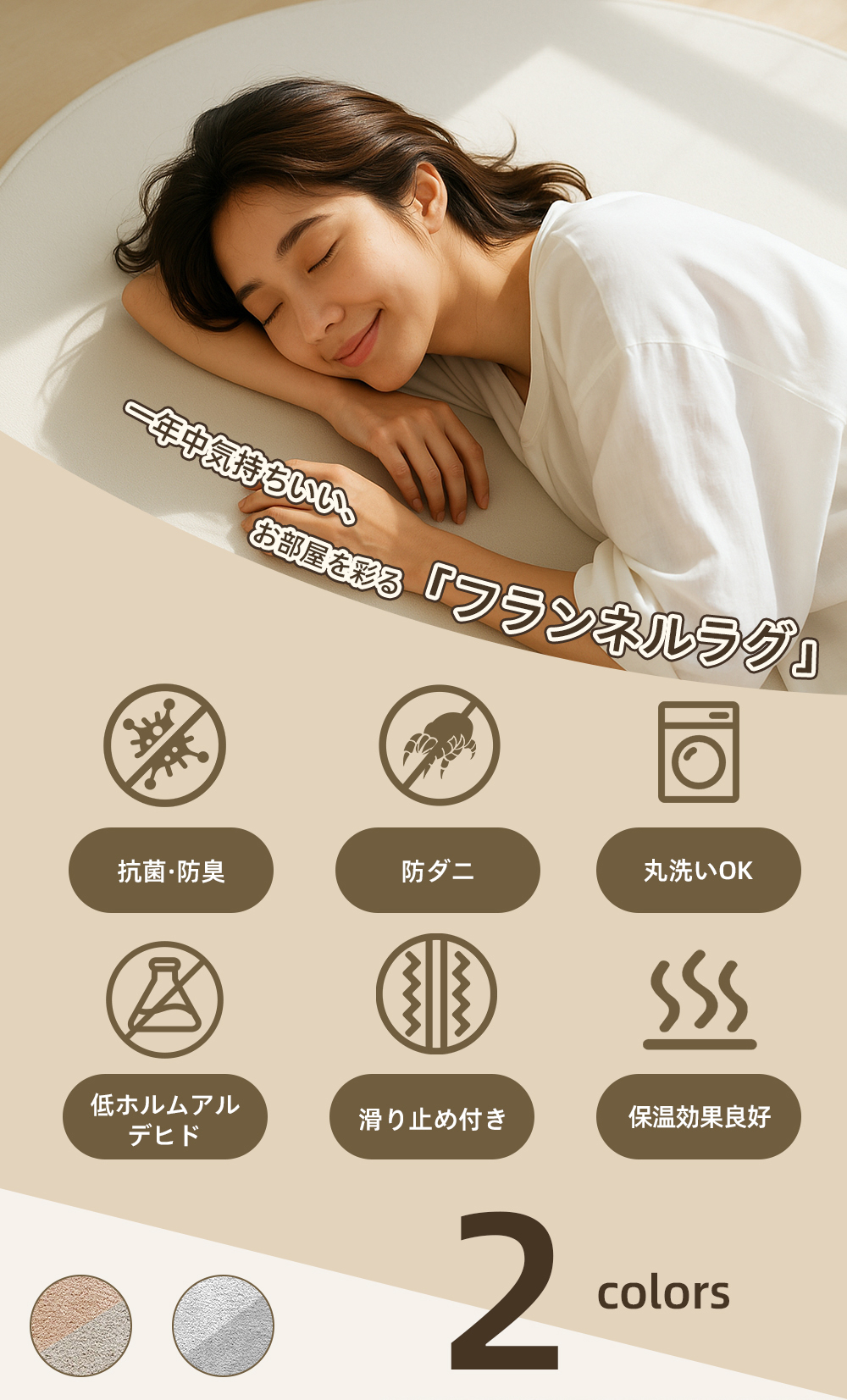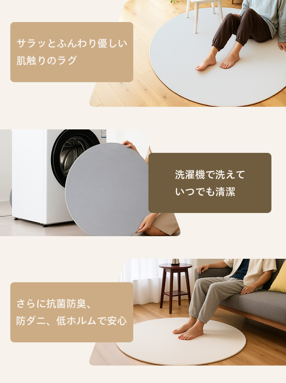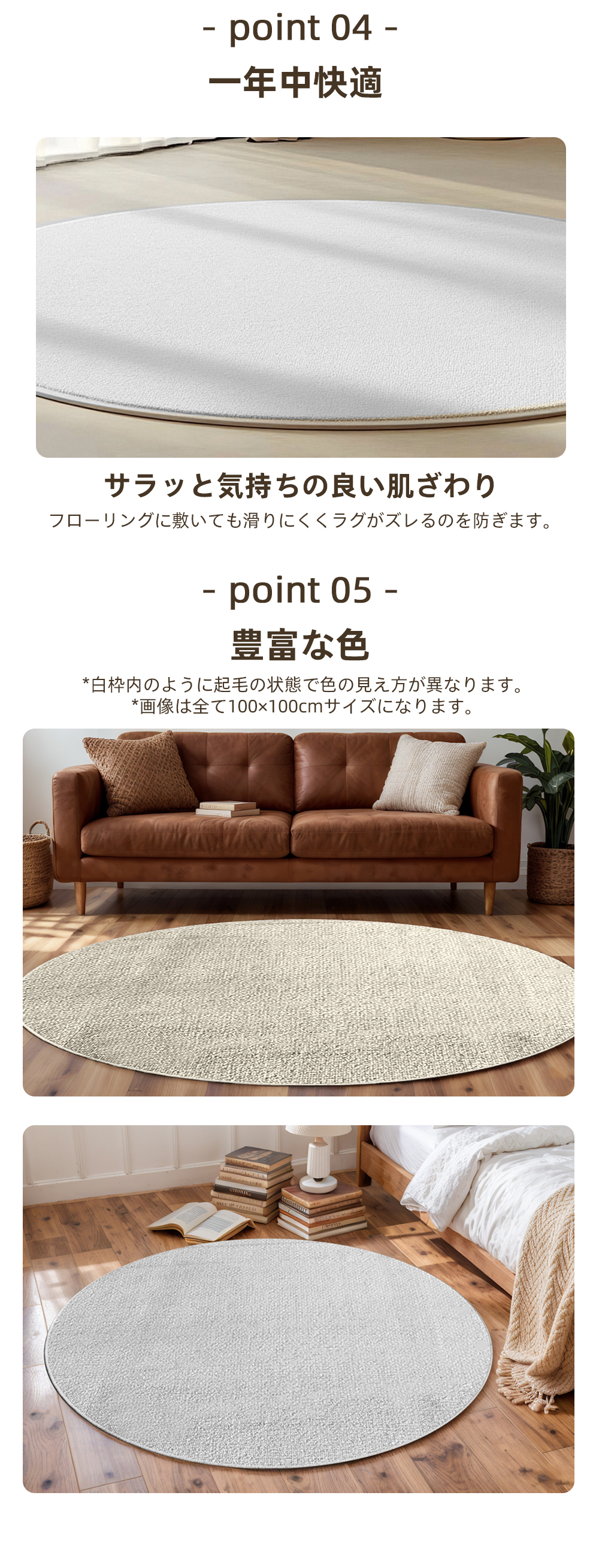ゆったり使える直径120cmの円形デザイン。広い範囲をしっかりカバーでき、リビング、子供部屋、寝室など様々なシーンで大活躍。ヨガやストレッチ用マットとしてもおすすめです。