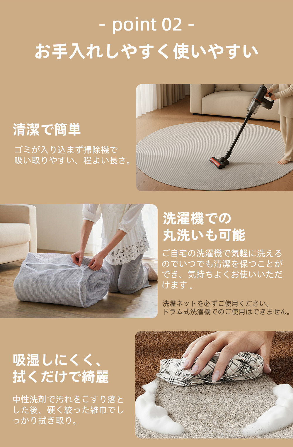 マット全体をそのまま洗濯機で丸洗いできるので、いつでも清潔に保てます。汗や食べこぼし、ペットの毛などの汚れも気軽に洗えて衛生的。忙しい方でも簡単にお手入れが可能です。