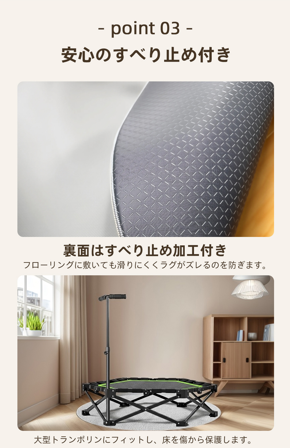マットの裏側には特殊な防滑加工を施しているため、床面にしっかりフィットし、ズレや滑りを防止します。小さなお子様や高齢の方がいるご家庭でも安全にご利用いただけます。