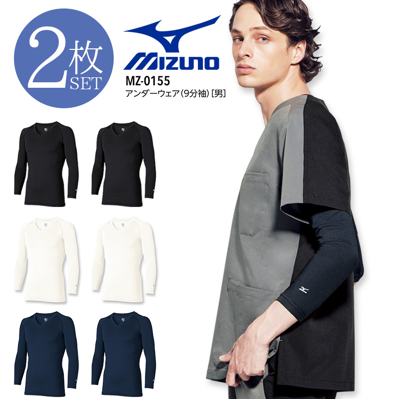 2枚セット ミズノ 男性用 アンダーウェア 9分袖 MZ-0155 ストレッチ 吸汗速乾 アンダーシャツ 看護師 ナース 介護士 病院 クリニック 医者 医療用 白衣 メンズ 九分袖 mizuno