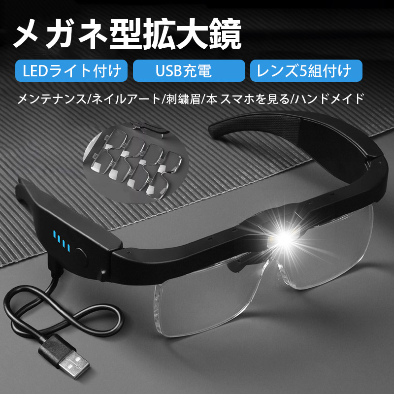 眼鏡型拡大鏡 メガネ型 拡大鏡 メガネ型 ルーペ メガネ USB充電 LEDライト レンズ5組付け ルーペメガネ 眼鏡型ルーペ ルーペ 虫眼鏡 爆買