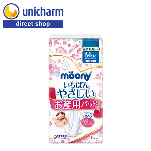 「ム−ニ− お産用パッド Mサイズ」は、羽つきナプキン形状で使いやすいサイズ(17.5cm×40cm)。※生理用ナプキンではありません。