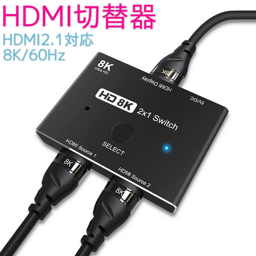 | 最大8K/60Hz出力対応 2入力1出力 HDMI切替器 ・〜・〜・〜・〜・〜・〜・〜・〜・〜・〜・〜・〜・〜・〜・〜・〜・〜・〜・〜・〜・ 2つのHDMI入力機器を1つのモニターやTVに 切り替えて出力できる HDMI切替器です。 規格の最新バージョン HDMI 2.1 に対応しているので、 8K/60Hz、4K/120Hz出力に対応しています。 |
