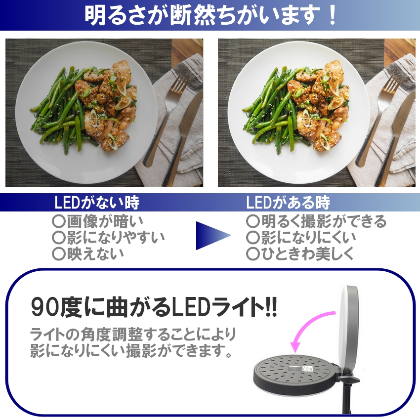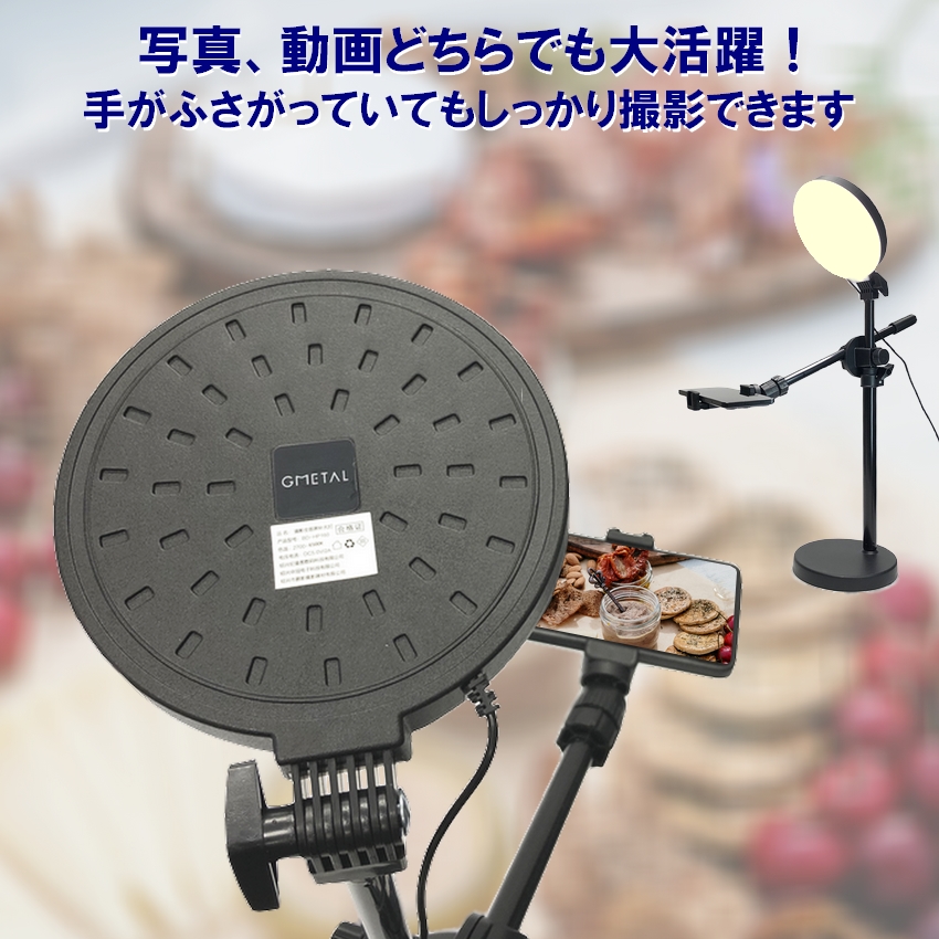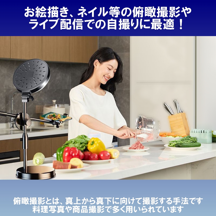 〇料理写真などの卓上の俯瞰撮影、ライブ配信などの自撮り撮影両方に適したLEDライトが付属したスマホスタンドセットです。