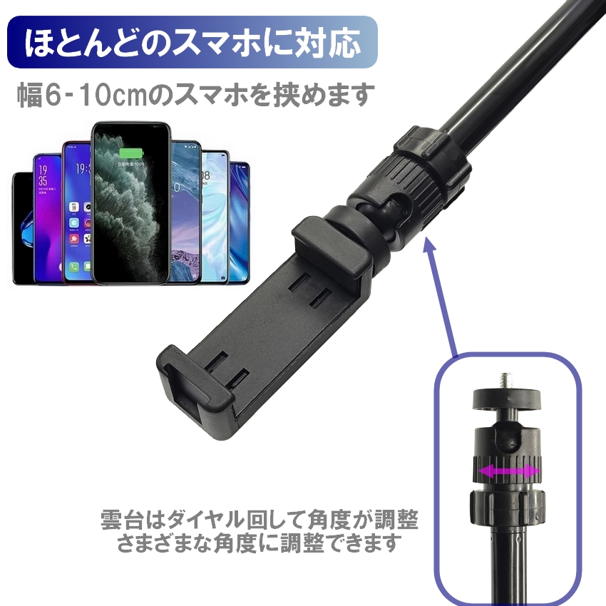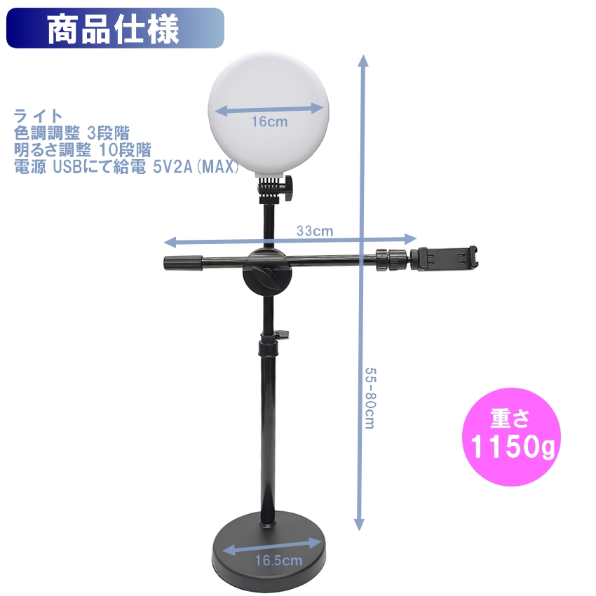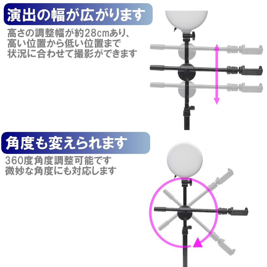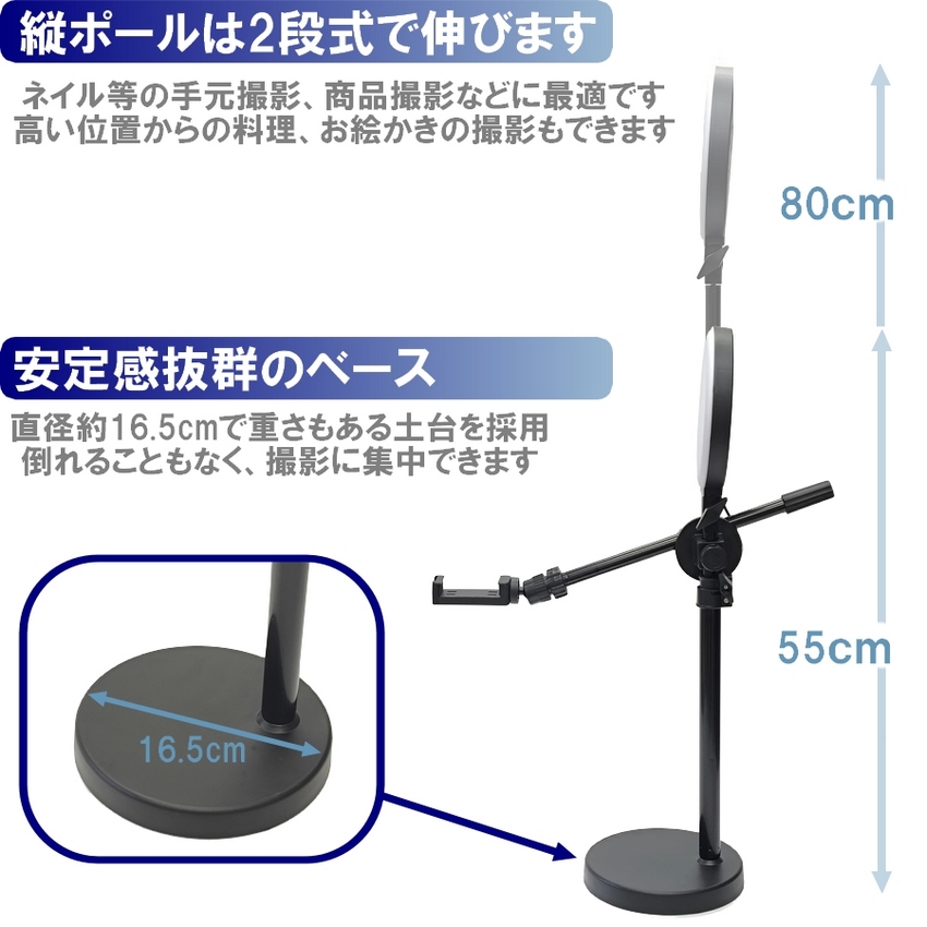 | このスマホスタンドは、真上からの俯瞰撮影を可能にする便利なアイテムです。 高さは最大80cm!! 縦ポールは伸縮自由自在です。 16cm全面ライト付き 明るくしっかり撮影ができます ライトは3色モード付き、10段階調整可能なので用途に合わせて自由に変更することができます USB給電なので、パソコン、電源アダプター、モバイルバッテリーなどに接続して使うことができます 料理やDIYの手元撮影、リモートワーク、ゲーム実況などさまざまシーンで活躍します |