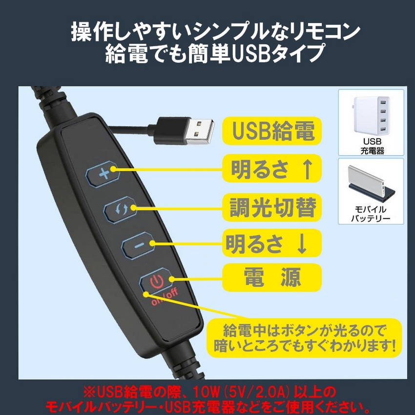 ※LEDライトには5V/2A出力以上のUSB電源をご使用ください。出力の弱いものですとライトが点かない場合がございます。