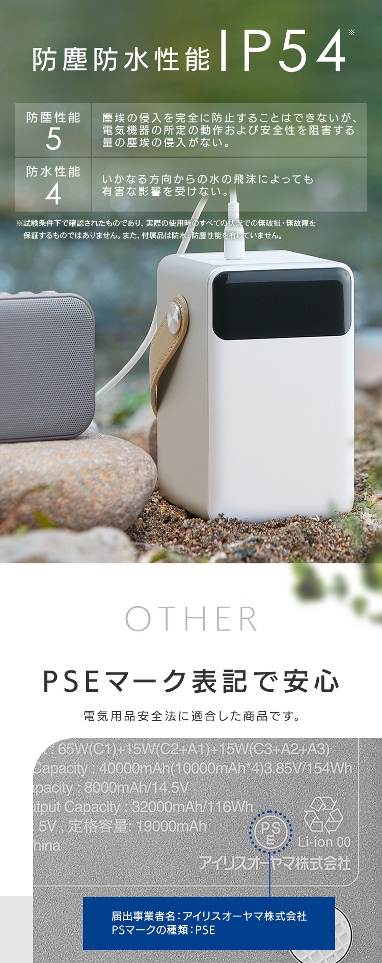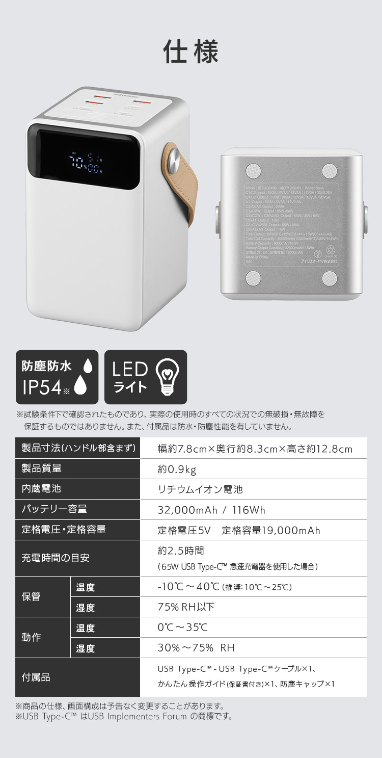 (検索用:バッテリーステーション アイリスオーヤマ コンパクト 32000mAh USB type-C 防塵 防水 パソコン 充電可 LEDライト 防災 停電 アウトドア パソコン ポータブル電源 モバイルバッテリー 大容量 ミニ 4967576802673)