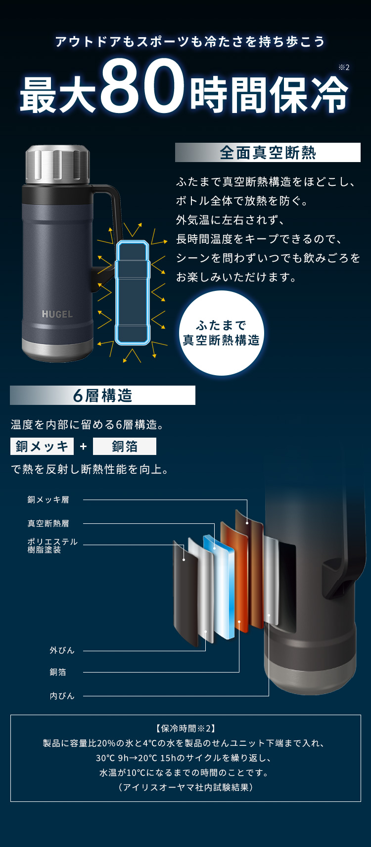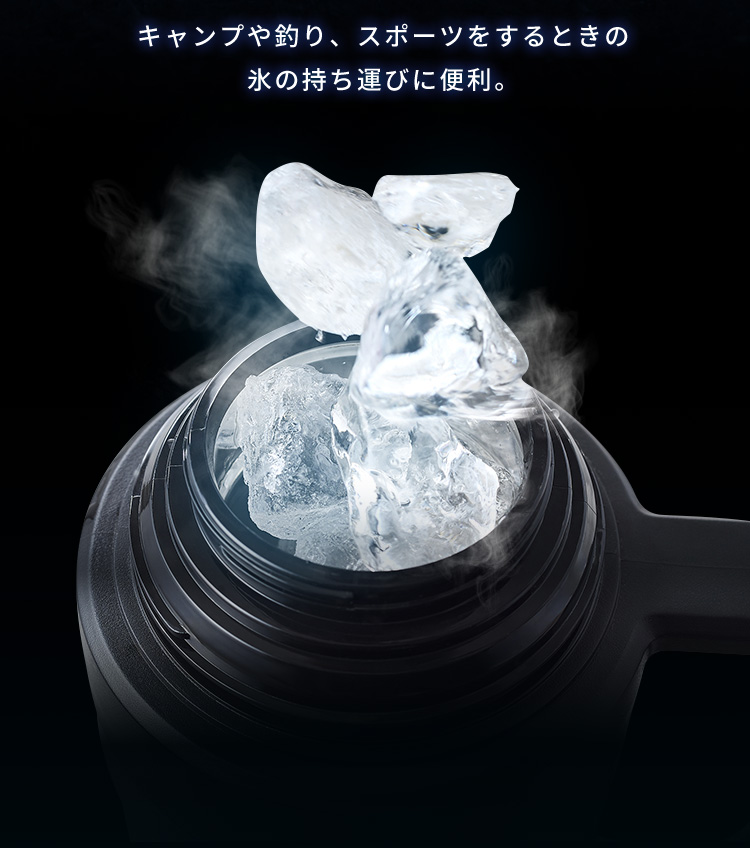 ※1 保冷時間/製品に容量比20%の氷と4℃の水を製品のふたまたはせんユニット下端まで入れ、30℃9h→20℃15hのサイクルを繰り返し、水温が10℃になるまでの時間のことです。(社内試験結果)